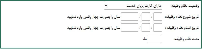این بخش مربوط به وضعیت نظام وظیفه داوطلبین آقا میباشد که لازم است وضعیت نظام وظیفه را از بین گزینههای موجود انتخاب کرده و سپس مواردی مانند تاریخ شروع و پایان سربازی و مدت زمان خدمت نظام وظیفه را وارد نمایید.