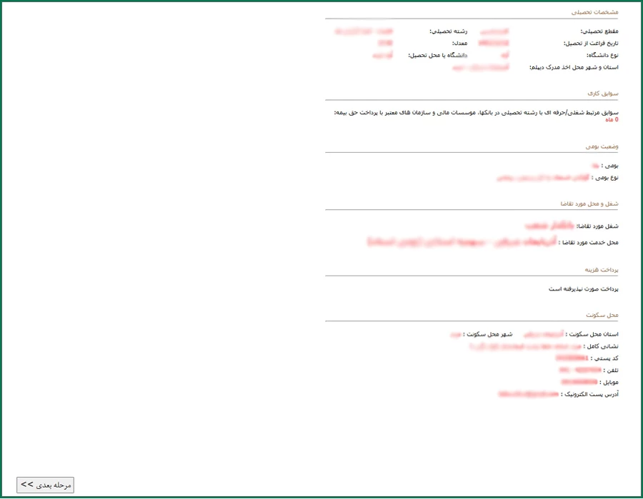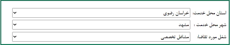 در این بخش باید اطلاعاتی مانند استان محل خدمت، شهر محل خدمت و شغل موردتقاضا را وارد نمایید.