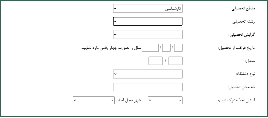 بخش ششم مربوط به مشخصات تحصیلی است که در آن باید اطلاعاتی مانند مقطع، رشته و گرایش تحصیلی را از بین گزینههای موجود انتخاب کرده و سپس مواردی نظیر تاریخ فراغت از تحصیل، معدل و.. را وارد نمایید.