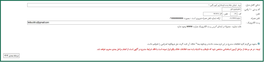 این بخش، مربوط به اطلاعات آدرس و تلفن محل سکونت است که در آن باید مواردی مانند نشانی کامل، کد پستی، شماره تلفن و.. را وارد نمایید.