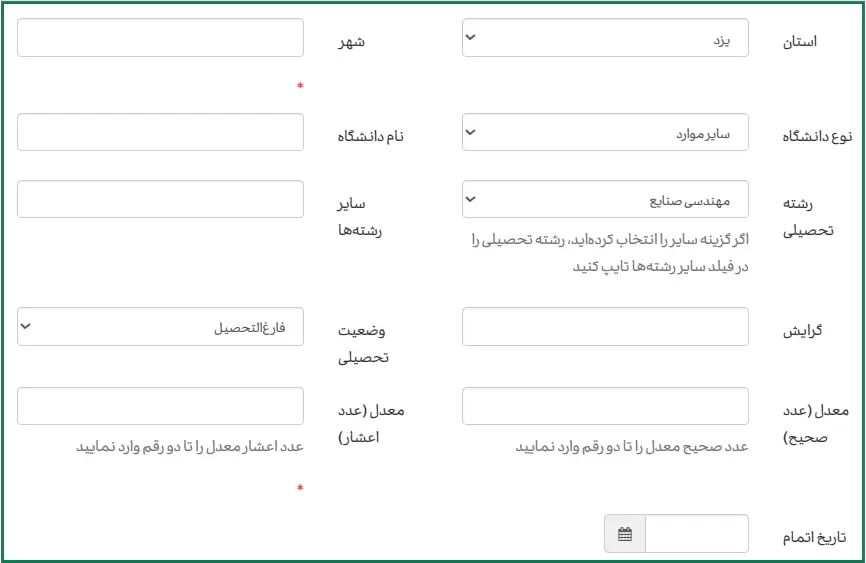 این بخش مربوط به اطلاعات مقطع متوسطه است که در آن باید مواردی نظیر استان، رشته تحصیلی، تاریخ اتمام و… را وارد نمایید.