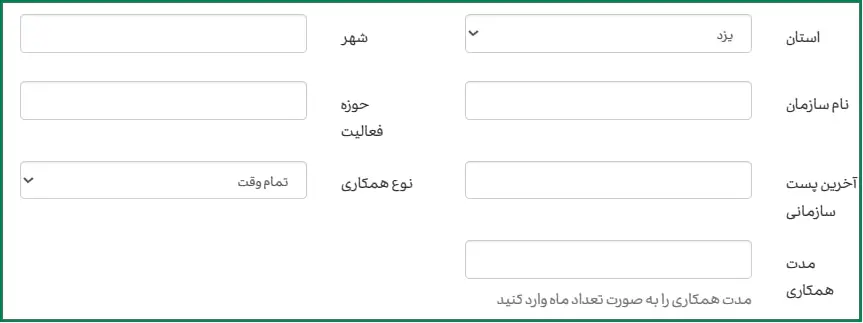 بخش چهارم مربوط به اطلاعات سوابق کاری است که میتوانید در آن مواردی نظیر نام سازمان، حوزه فعالیت، آخرین پست سازمانی و.. را وارد نمایید.