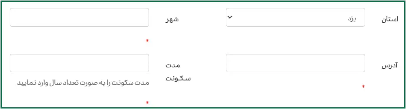 در این بخش باید اطلاعات محل سکونت خود، شامل استان و شهر، آدرس و مدت سکونت را وارد نمایید.