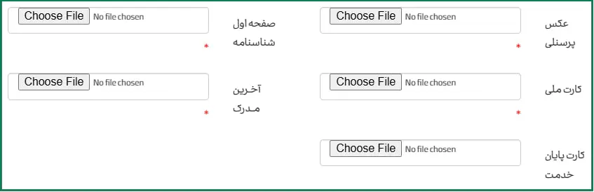 این بخش مربوط به ارسال مدارک موردنیاز است که در آن باید مواردی نظیر عکس پرسنلی، صفحه اول شناسنامه، کارت ملی و.. را بازگذاری نمایید.