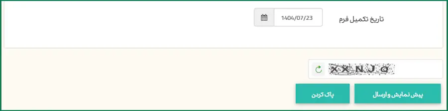 در این قسمت باید تاریخ تکمیل فرم را انتخاب کرده، سپس کد امنیتی نمایش داده شده را وارد نمایید و در ادامه روی دکمه "پیش نمایش و ارسال" کلیک کنید.
