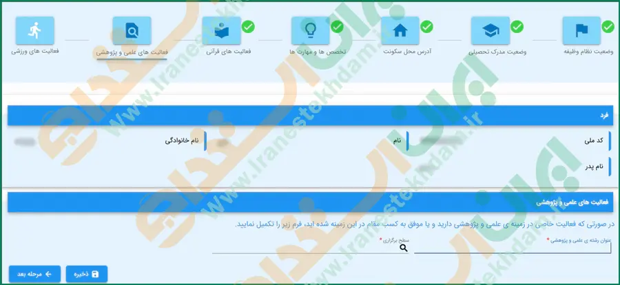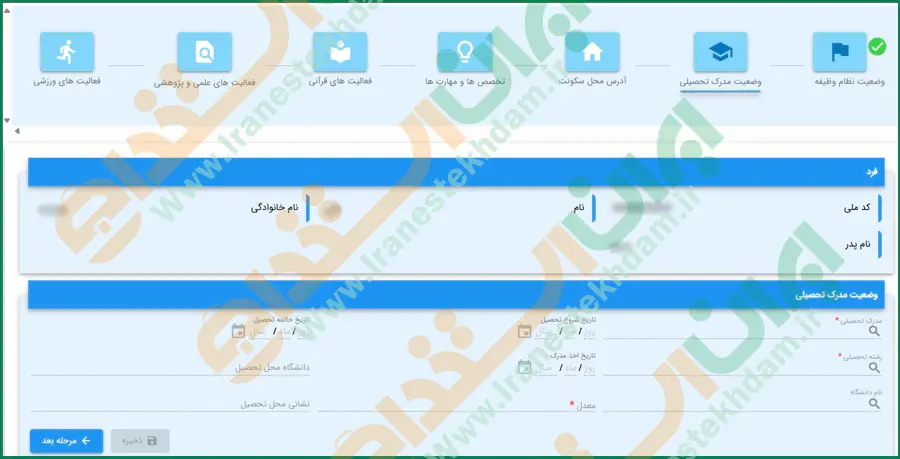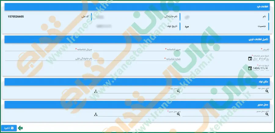در این بخش لازم است اطلاعات فردی، مکان تولد، محل صدور را وارد کرده و روی دکمه "ذخیره" کلیک نمایید.