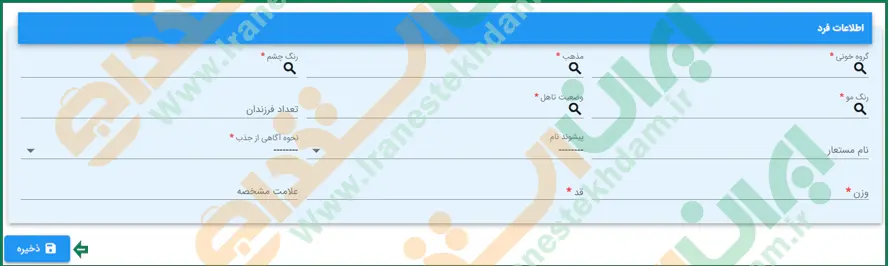 در این بخش، اطلاعات گروه خونی، مذهب، رنگ چشم و.. را وارد کرده سپس روی گزینه "ذخیره" کلیک کرده و در نهایت روی گزینه "مرحله بعد" کلیک نمایید.