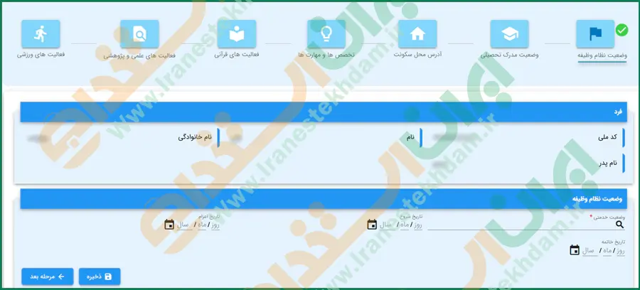 بخش اول مربوط به اطلاعات نظام وظیفه است که لازم است وضعیت خدمتی، تاریخ شروع، تاریخ اعزام و تاریخ خاتمه را وارد نمایید.