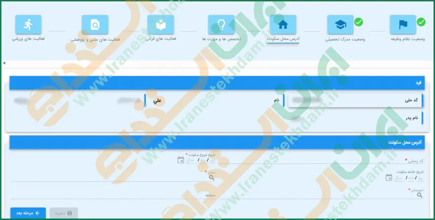 این بخش مربوط به آدرس محل سکونت است که باید در آن کد پستی، تاریخ شروع و پایان سکونت، شهرستان و.. را وارد نمایید.
