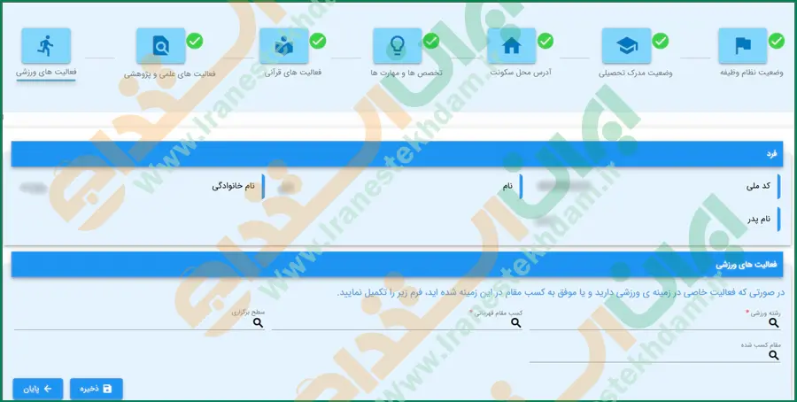 این بخش مربوط به فعالیتهای ورزشی است که لازم است اطلاعاتی مانند رشته ورزشی، کسب مقام، سطح برگزاری و.. را وارد کرده و روی دکمه "پایان" کلیک نمایید.