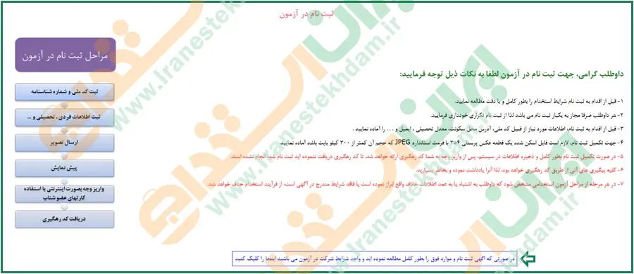 پس از کلیک روی گزینه ثبت نام، به سایت ایران آزمون منتقل میشوید و پیش از هر اقدامی لازم است دفترچه آزمون استخدامی بانک مهر را بهطور کامل مطالعه کرده و سپس روی دکمه مربوطه کلیک نمایید.