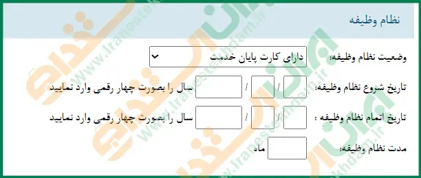 این بخش مربوط به وضعیت نظام وظیفه داوطلبین آقا میباشد که لازم است وضعیت نظام وظیفه را از بین گزینههای موجود انتخاب کرده و سپس مواردی مانند تاریخ شروع و اتمام سربازی و مدت زمان خدمت نظام وظیفه را وارد نمایید.