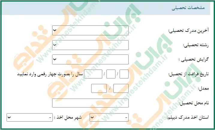 بخش سوم مربوط به مشخصات تحصیلی است که در آن باید اطلاعاتی مانند آخرین مدرک، رشته و گرایش تحصیلی را از بین گزینههای موجود انتخاب کرده و سپس مواردی نظیر تاریخ فراغت از تحصیل، معدل و.. را وارد نمایید.