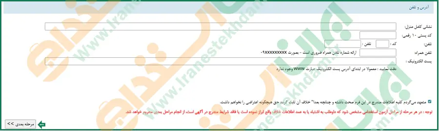 این بخش، مربوط به اطلاعات آدرس و تلفن محل سکونت است که در آن باید مواردی مانند نشانی کامل، کد پستی، شماره تلفن و.. را وارد نمایید.