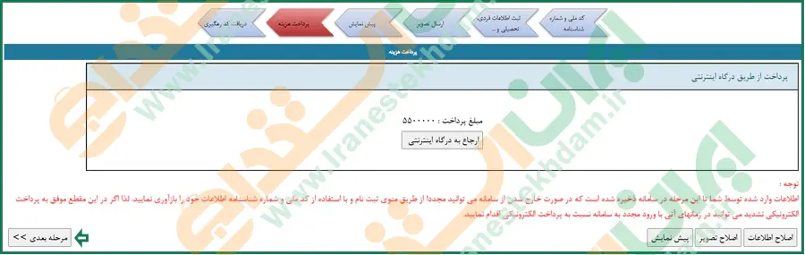 توجه: اطلاعات وارد شده توسط شما تا این مرحله در سامانه ذخیره شده است که در صورت خارج شدن از سامانه میتوانید مجددا از طریق منوی ثبت نام و با استفاده از کدملی و شماره شناسنامه اطلاعات خود را بازآوری نمایید. لذا اگر در این مقطع موفق به پرداخت الکترونیکی نشدید می توانید در زمانهای آتی با ورود مجدد به سامانه نسبت به پرداخت الکترونیکی اقدام نمایید.