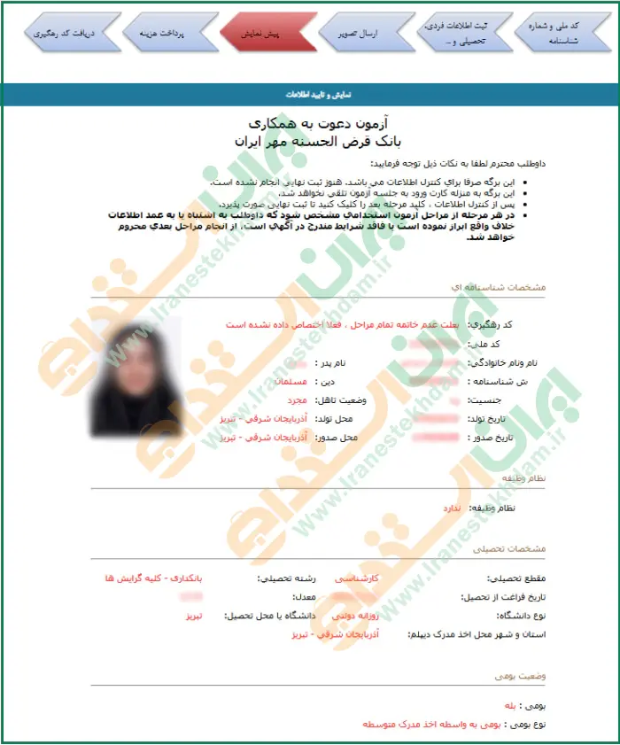 در این مرحله پیش نمایش اطلاعات ثبت شده نمایش داده میشود که در صورت نیاز میتوانید از طریق گزینه "اصلاح اطلاعات" آن را ویرایش نمایید.