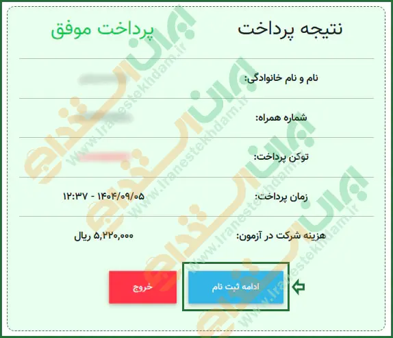 پس از پرداخت هزینه، به سایت مجری آزمون منتقل شده و پیغام پرداخت موفق نمایش داده میشود. در ادامه باید روی دکمه "ادامه ثبت نام" کلیک نمایید.