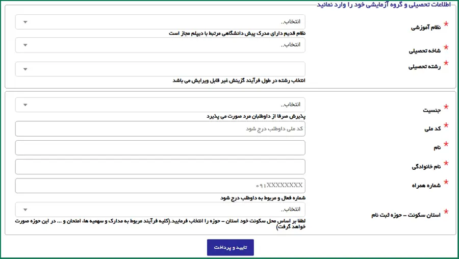 در این مرحله اطلاعات تحصیلی و گروه آزمایشی خود، شامل نظام آموزشی، شاخه و رشته تحصیلی، جنسیت و.. را وارد کرده و روی دکمه "تأیید و پرداخت" کلیک نمایید.
