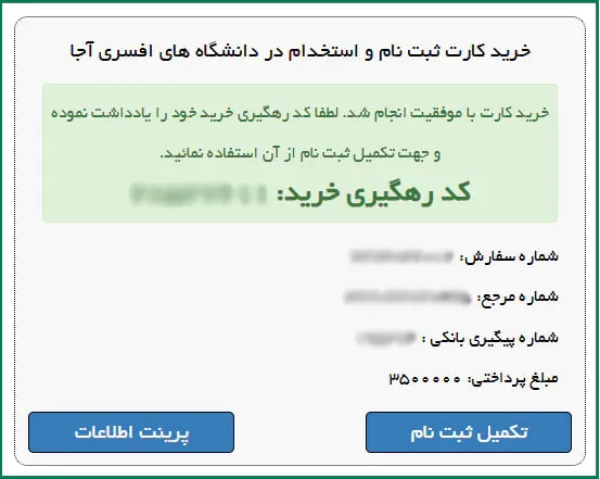پس از انجام پرداخت، پیام پرداخت موفقیتآمیز نمایش داده میشود سپس صفحهای مشابه تصویر زیر شامل اطلاعات بانکی و کد رهگیری ظاهر میشود. در نهایت، برای تکمیل فرآیند ثبت نام، روی دکمه مربوطه کلیک نمایید.