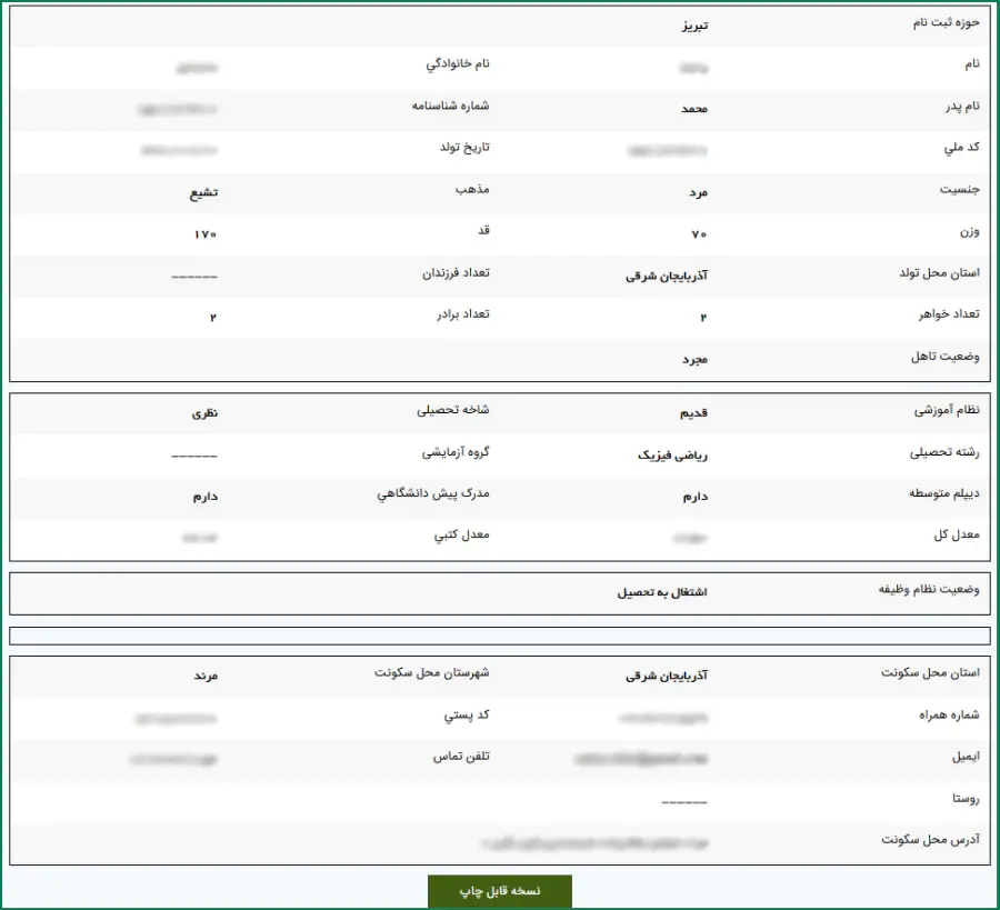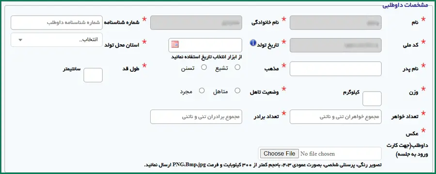 این بخش مربوط به اطلاعات هویتی است که باید در آن مواردی نظیر نام و نام خانوادگی، شماره شناسنامه، تاریخ تولد و.. را وارد نمایید.