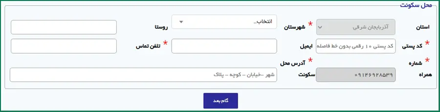 در این بخش اطلاعات محل سکونت خود شامل استان، شهرستان، کد پستی و.. را وارد نمایید.