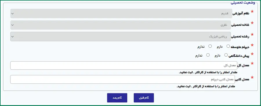 این مرحله مربوط به اطلاعات سوابق تحصیلی است که باید در آن مواردی نظیر دیپلم متوسطه، پیشدانشگاهی، معدل کل و.. را وارد نمایید.