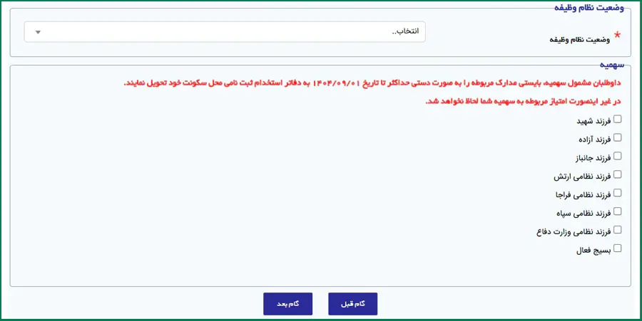 مرحله دهم: ثبت وضعیت نظام وظیفه و انتخاب سهمیهها