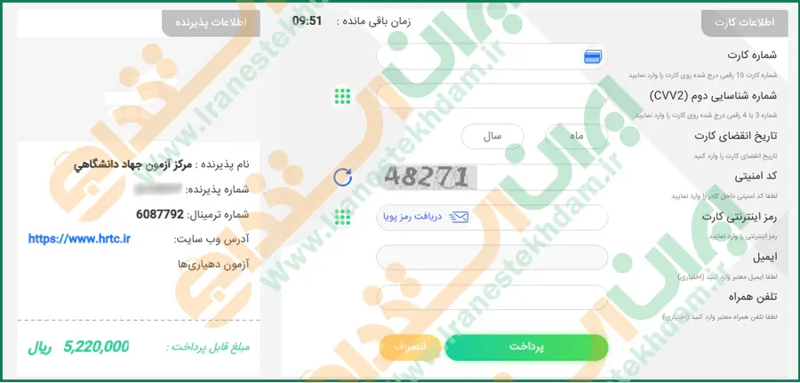 پس از کلیک روی گزینه پرداخت هزینه به درگاه پرداخت اینترنتی منتقل میشوید که لازم است پس از وارد کردن اطلاعات بانکی خود، روی گزینه "پرداخت" کلیک نمایید.