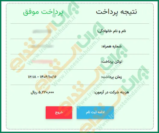 پس از پرداخت هزینه، به سایت مجری آزمون منتقل شده و پیغام پرداخت موفق نمایش داده میشود. در ادامه باید روی دکمه "ادامه ثبت نام" کلیک نمایید.