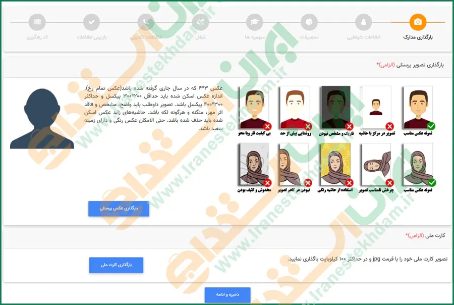 در این مرحله باید عکس پرسنلی و کارت ملی خود را بارگذاری کرده و روی دکمه "ذخیره و ادامه" کلیک نمایید.
