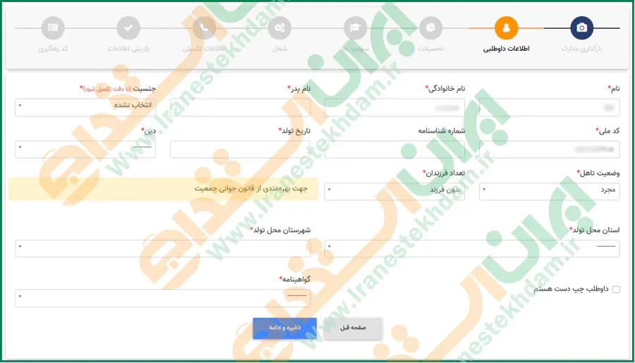 این مرحله مربوط به اطلاعات هویتی است که باید در آن مواردی نظیر نام و نام خانوادگی، نام پدر، جنسیت و.. را وارد نمایید.