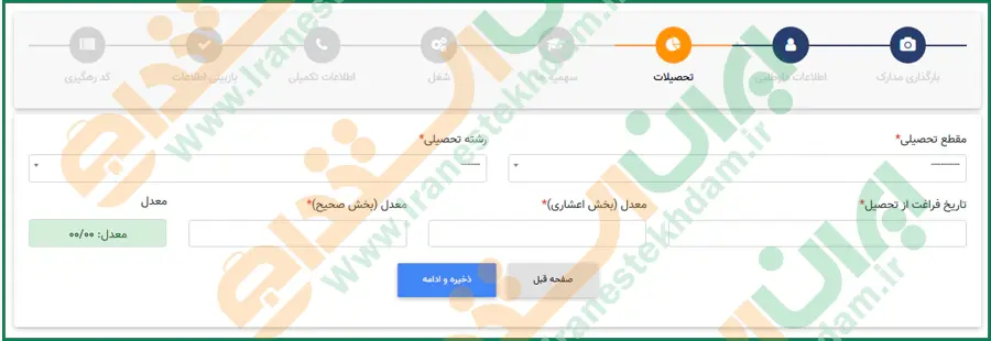 در این مرحله لازم است مقطع و رشته تحصیلی خود را انتخاب کرده سپس تاریخ فراغت از تحصیل و معدل را وارد نمایید.