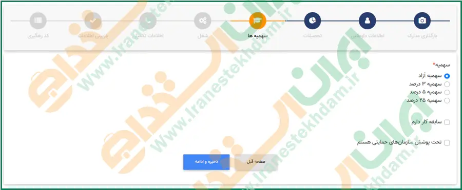 در این مرحله، در صورت داشتن سهمیه، سابقه کار و تحت پوشش بودن یک سازمان حمایتی، تیک گزینه مربوطه را فعال کنید.