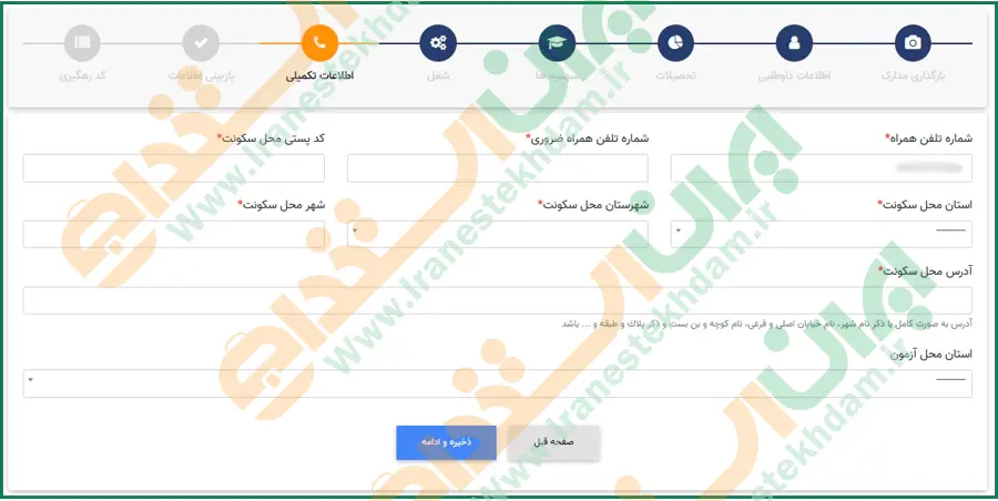 این مرحله مربوط به اطلاعات تماس و محل سکونت است که باید مواردی مانند شماره تلفن همراه و اضطراری، کد پستی، استان محل سکونت و.. را وارد نمایید.