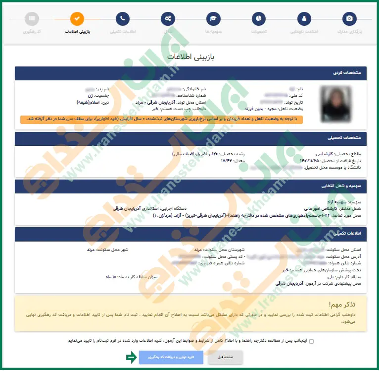 در این مرحله کد رهگیری ثبت نام برای شما ارسال می شود. پس از دریافت کد، میتوانید با مراجعه به بخش مشاهده اطلاعات، جزئیات ثبت نام خود را مشاهده کرده و در صورت نیاز، از آن پرینت تهیه نمایید. همچنین برای ویرایش اطلاعات ثبت شده، میتوانید روی گزینه "ورود به پروفایل" کلیک نمایید.