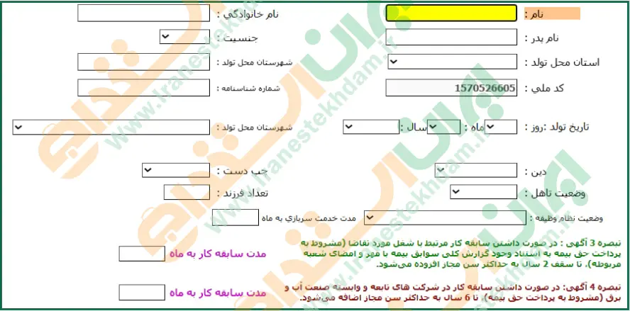 در این بخش، اطلاعات هویتی خود شامل نام و نام خانوادگی، نام پدر، جنسیت و.. را وارد کرده و سپس در صورت داشتن سابقه، مدت سابقه خود را بهصورت ماه وارد نمایید.