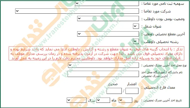 در این بخش، اطلاعاتی نظیر سهمیه ثبتنامی مورد تقاضا، شرکت مورد تقاضا، وضعیت بومیبودن داوطلب و.. را وارد کرده و سپس اطلاعات سوابق تحصیلی خود را ثبت نمایید.