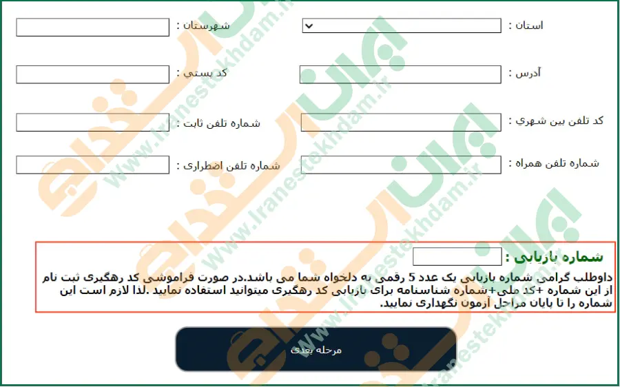 این بخش مربوط به اطلاعات محل سکونت است و لازم است مواردی نظیر استان، شهرستان، آدرس و.. را وارد کرده و سپس شماره بازیابی خود را ثبت نموده و روی دکمه "مرحله بعدی" کلیک نمایید.