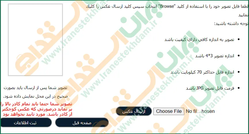در این مرحله، روی دکمه "Choose File" کلیک کرده و تصویر خود را بارگذاری کنید. سپس گزینه "ارسال عکس" را بزنید و در ادامه روی دکمه "ثبت اطلاعات" کلیک نمایید.
