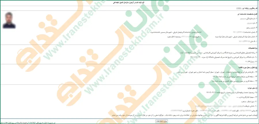 در این مرحله، پیش نمایش اطلاعات وارد شده نمایش داده میشود و در صورت نیاز به چاپ یا ویرایش اطلاعات، میتوانید روی گزینههای مربوطه کلیک نمایید.