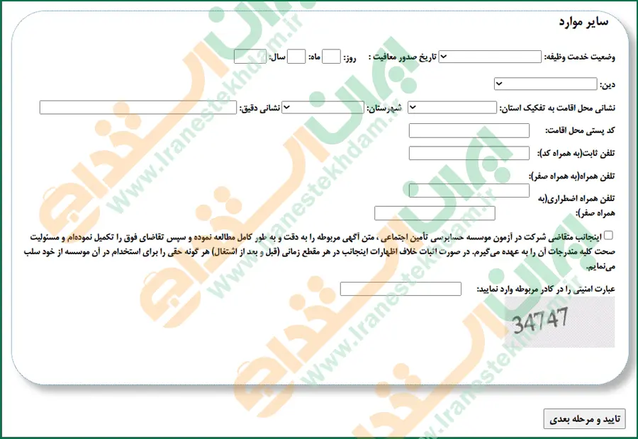 این بخش مربوط به وضعیت نظام وظیفه و اطلاعات محل سکونت و تماس است که در آن لازم است مواردی مانند وضعیت نظام وظیفه، نشانی محل سکونت، تلفن ثابت و.. را وارد نمایید. در ادامه روی دکمه "تایید و مرحله بعدی" کلیک نمایید