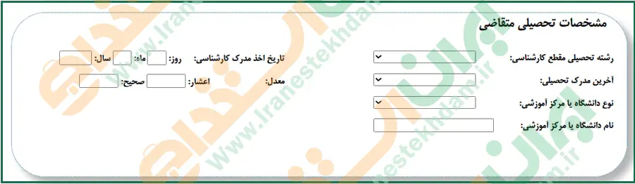 در این بخش اطلاعات سوابق تحصیلی خود شامل رشته تحصیلی، آخرین مدرک تحصیلی، نوع دانشگاه یا مرکز آموشی و.. را وارد نمایید.