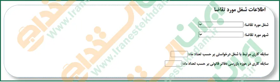 این بخش شامل انتخاب مشاغل مورد تقاضا است که در آن لازم است شغل و شهر مورد نظر را از میان گزینههای موجود انتخاب کرده و سپس سابقه کاری مرتبط با شغل درخواستی و دفاتر قانونی را وارد نمایید.