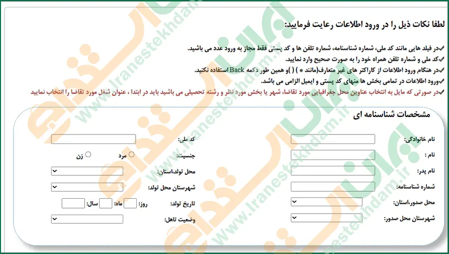 در این بخش، اطلاعات شناسنامهای خود شامل نام و نام خانوادگی، کد ملی، نام پدر و.. را وارد نمایید.