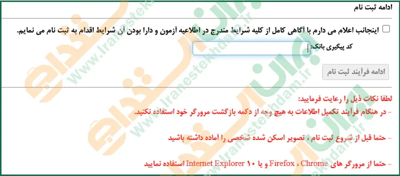 در این مرحله لازم است روی گزینه شروع ثبت نام کلیک کرده و کد پیگیری بانکی را وارد نمایید و تیک گزینه مربوطه را فعال کنید، سپس روی دکمه "ادامه فرآیند ثبت نام" کلیک نمایید.