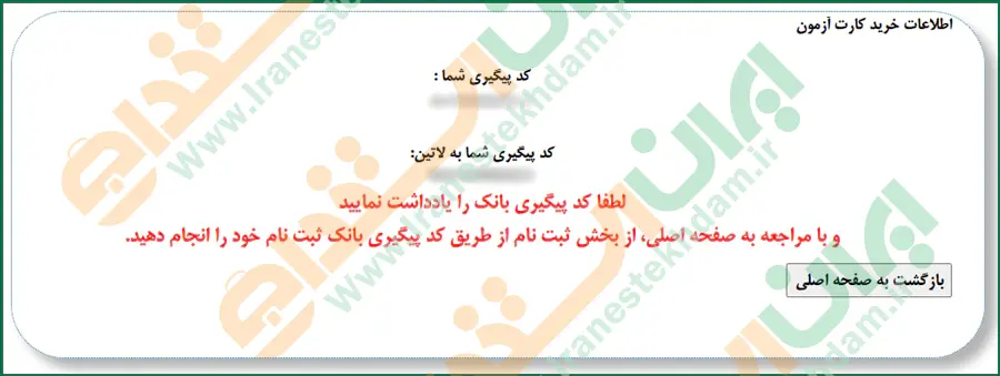 پس از پرداخت هزینه، به سایت مجری آزمون منتقل شده و اطلاعات خرید کارت آزمون نمایش داده میشود. در ادامه باید روی دکمه "بازگشت به صفحه اصلی" کلیک نمایید.