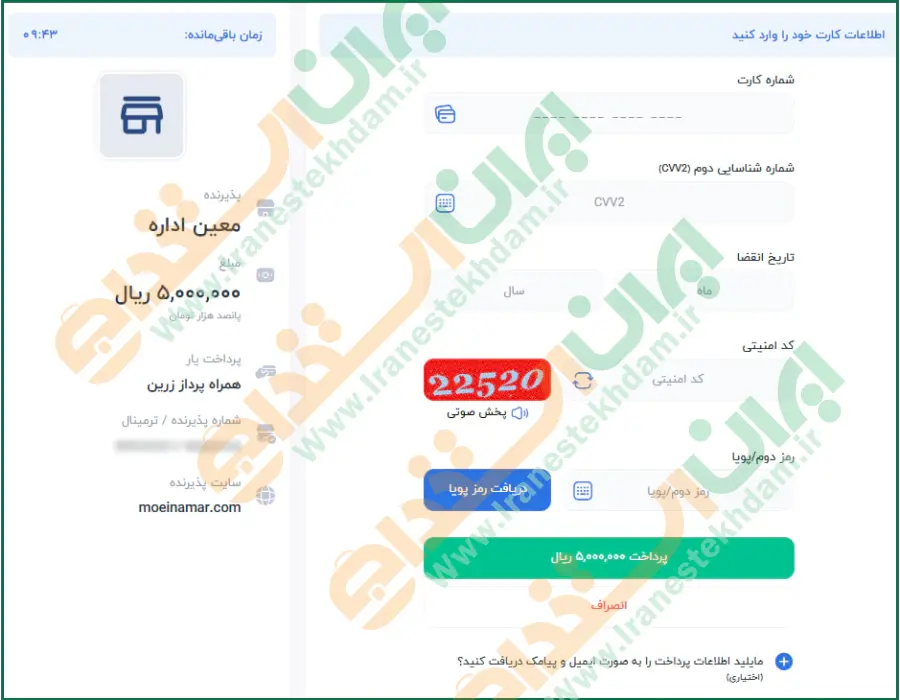 در این مرحله به درگاه پرداخت اینترنتی منتقل میشوید که لازم است پس از وارد کردن اطلاعات بانکی خود، روی گزینه "پرداخت" کلیک نمایید.