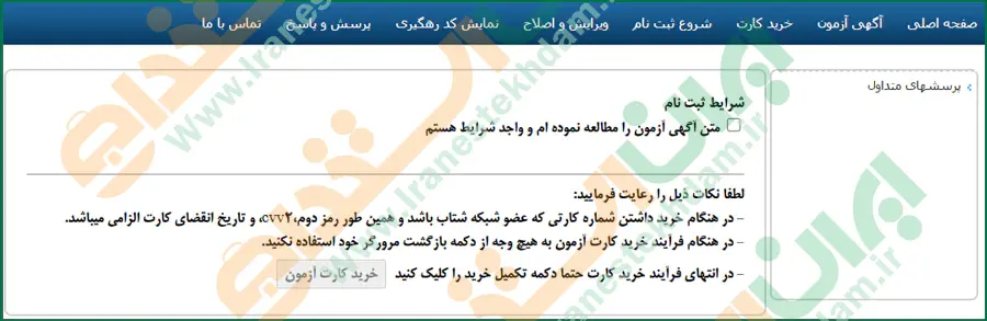 پس از کلیک روی گزینه تایید، متن آگهی آزمون را مطالعه کرده، تیک گزینه شرایط ثبت نام را فعال کنید و سپس روی دکمه "خرید کارت آزمون" کلیک نمایید.