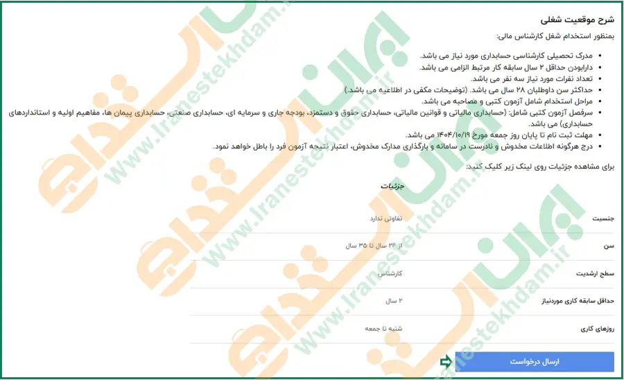 پس از بررسی توضیحات شغلی و اطمینان از تطابق آن با مهارتها و سوابق کاری خود، روی گزینه "ارسال درخواست" کلیک نمایید.