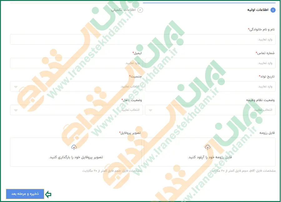 در این مرحله، اطلاعات هویتی خود شامل نام و نام خانوادگی، شماره تماس، ایمیل و .. را وارد کنید سپس فایل رزومه و تصویر پروفایل خود را بارگذاری کرده و روی دکمه "ذخیره و مرحله بعد" کلیک نمایید.